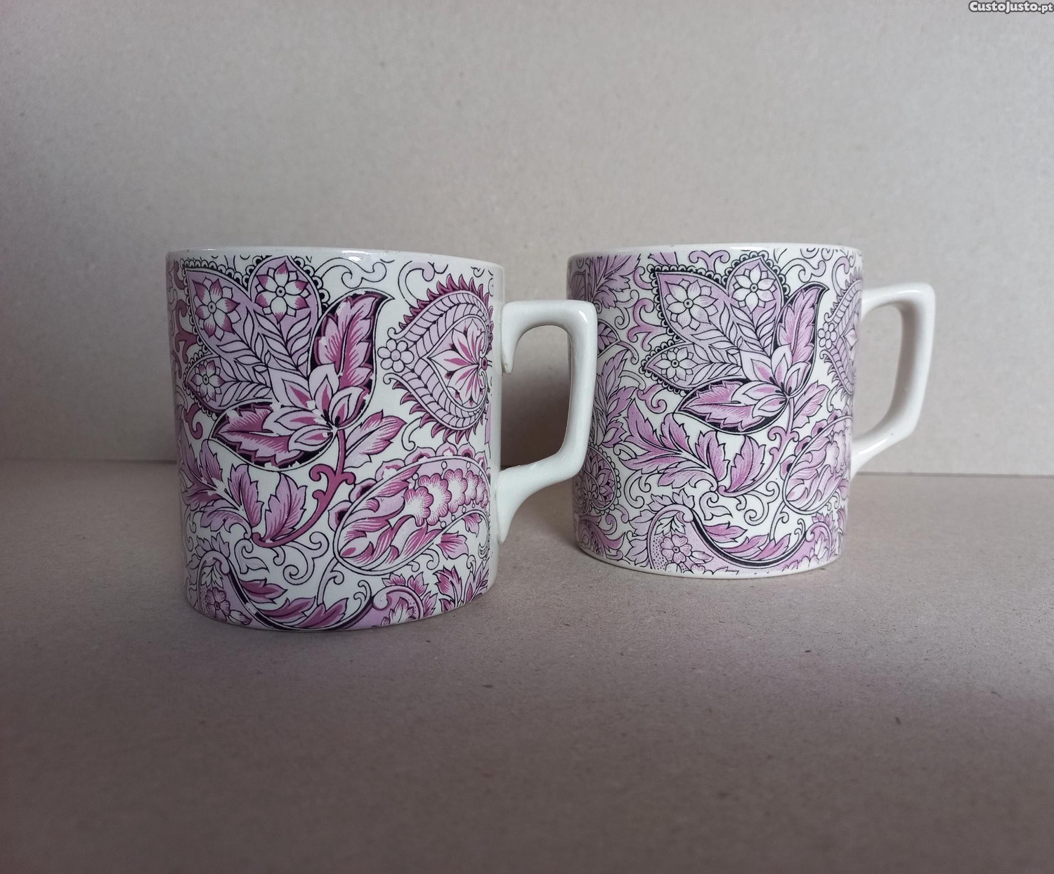Duas lindíssimas Canecas Sacavém, uma maior que a outra. A maior em óptimo estado, craquelé no interior. A menor com alguns pontos de descasque pouco perceptíveis e mínima falhinha no bordo cf foto. No fundo pequena linha amarelada( não é cabelo). Maior com 8,5 cm altura e 8,5 cm diâmetro; menor com 8 cm altura e 8 cm diâmetro.