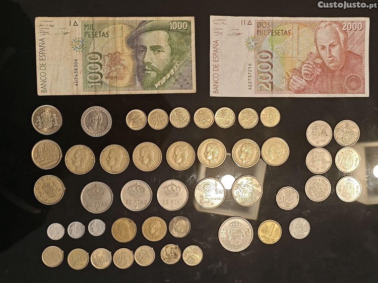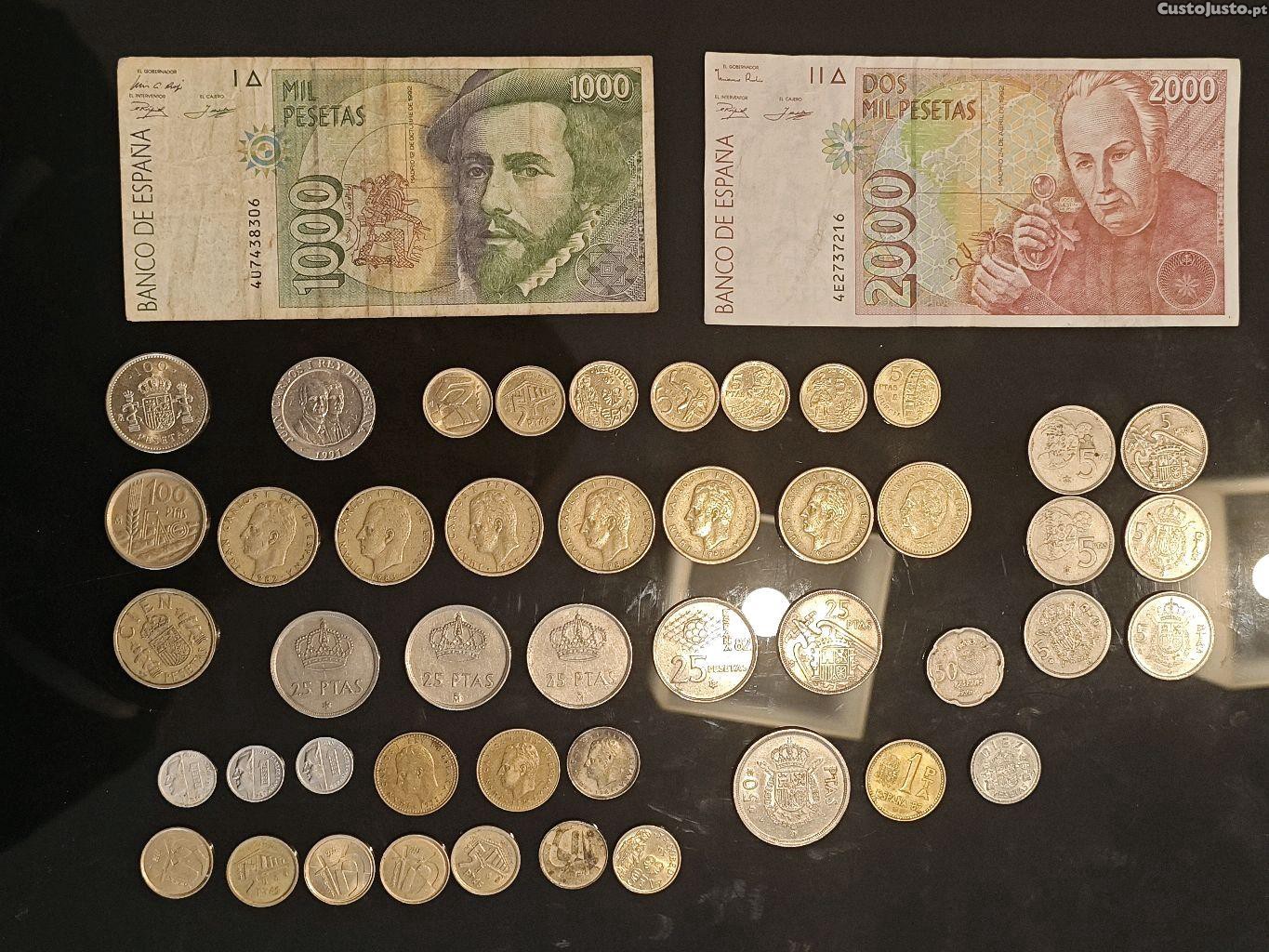 Conjunto de 2 notas e 46 moedas de pesetas espanholas.