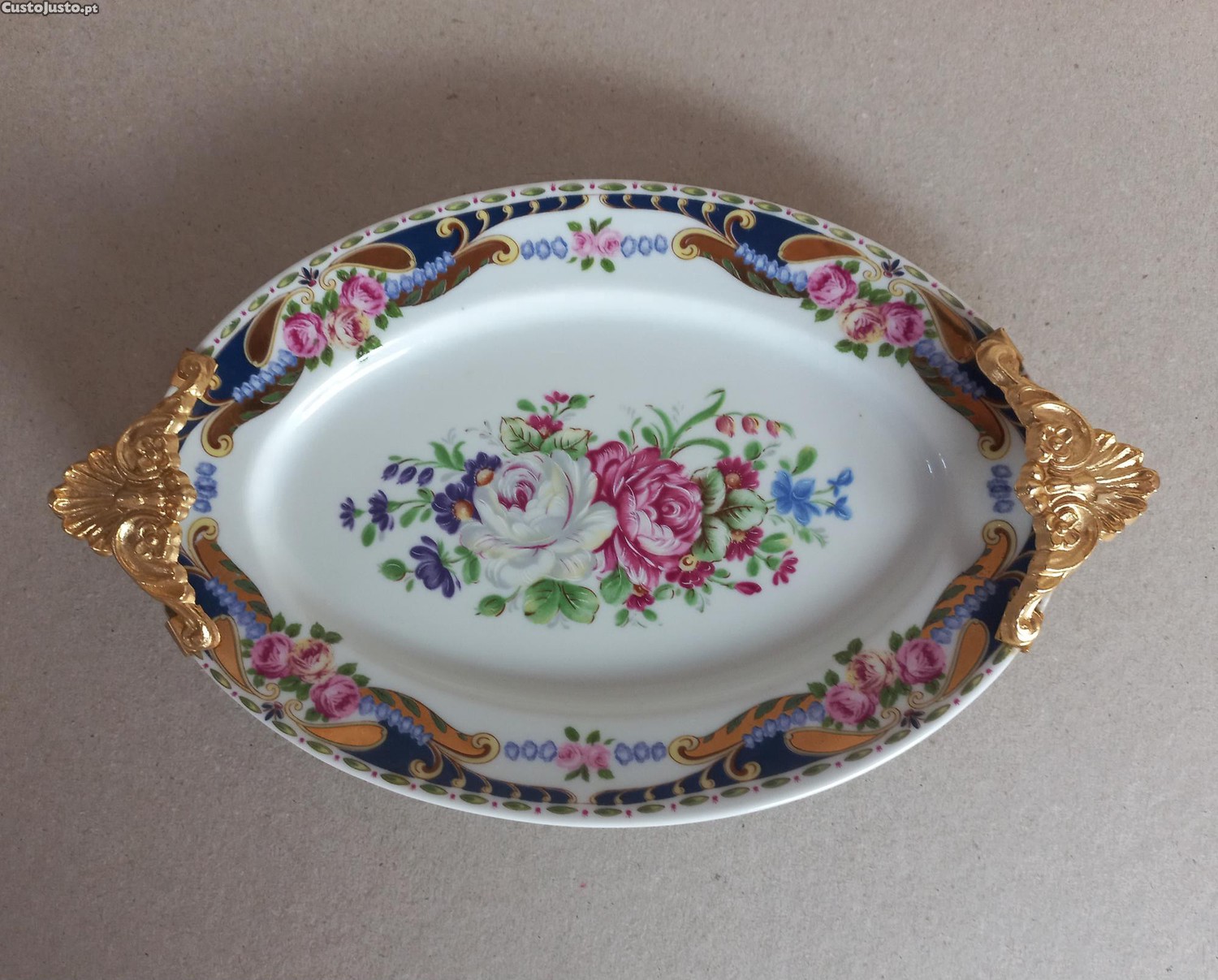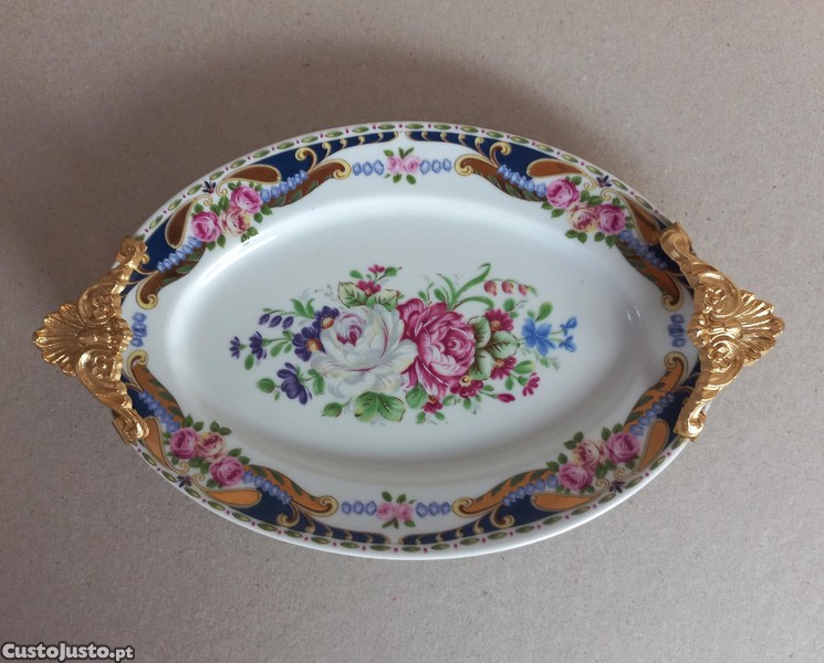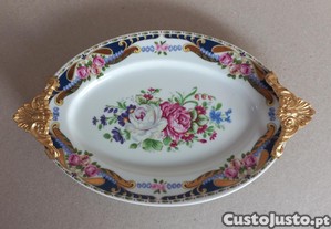 Muito bonita esta pequena Travessa em porcelana Italiana ao estilo Limoges. Decoração floral com asas em metal Dourado. Em óptimo estado.