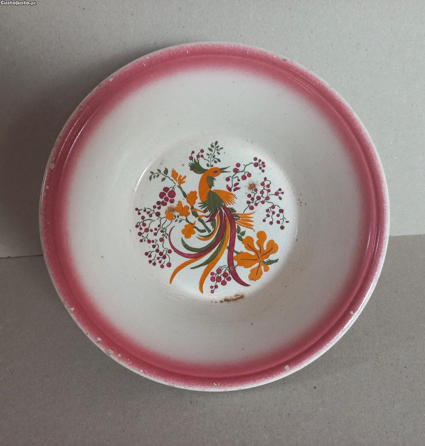 Apresenta algumas imperfeições cf fotos, ao centro na parte inferior parece-me de fabrico, pequenos toques ao redor do bordo, apesar das anotações está muito bonita.
