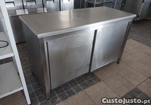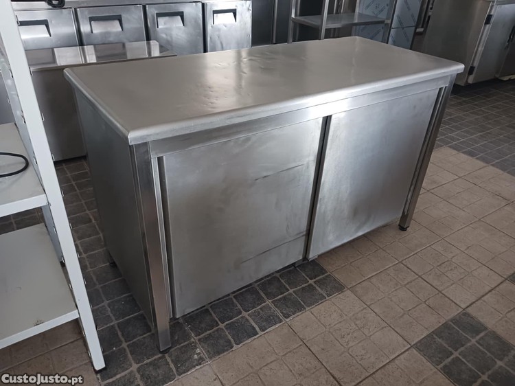 Descrição: Bancada de apoio central em inox totalmente fechada, com 2 portas deslizantes e 1 prateleira intermédia.