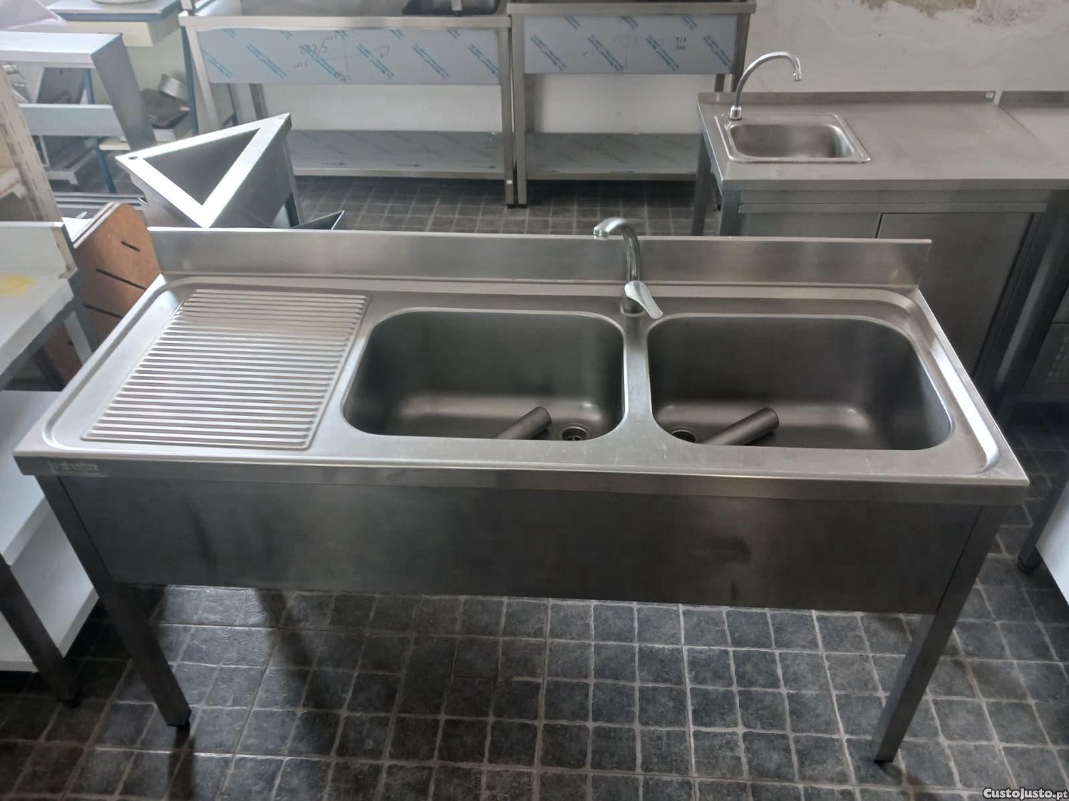Descrição: Bancada de lavagem em inox com 2 cubas grandes. Com torneira misturadora e alçado posterior de 100mm.