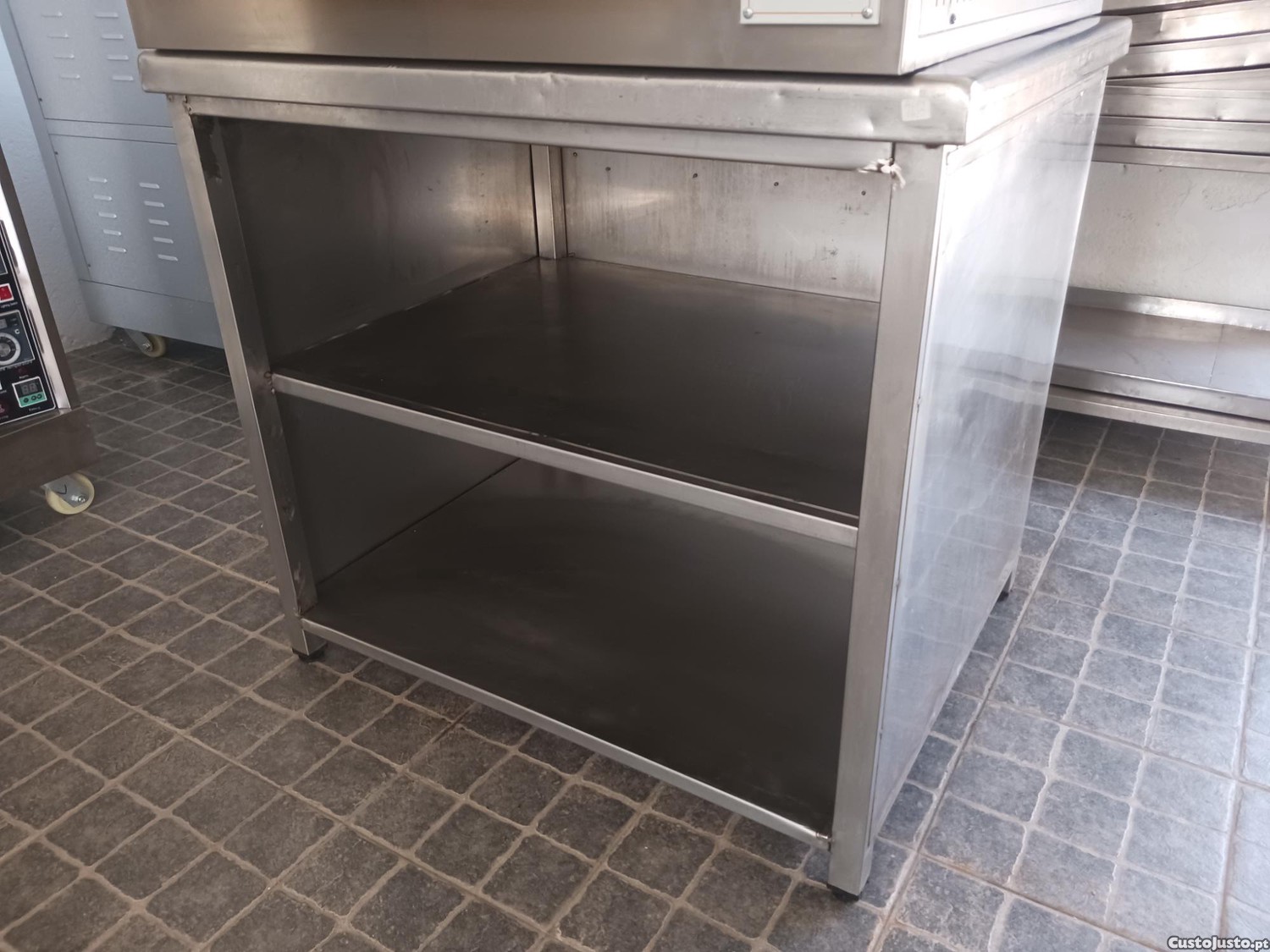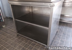 Bancada de apoio em inox totalmente fechada com prateleira intermedia. Usado