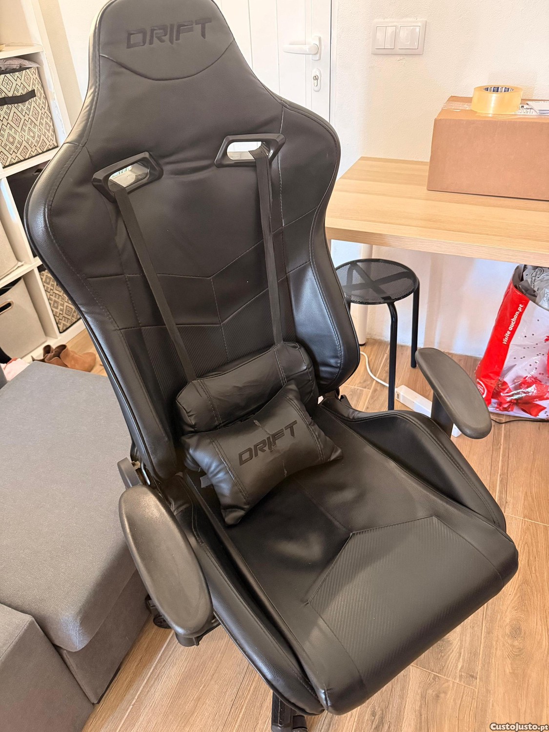 Vendo cadeira gaming da marca Drift, totalmente revestida em pele sintética preta de alta qualidade. Este modelo destaca-se pelo seu design ergonómico inspirado nos bancos de competição, sendo ideal para quem passa longos períodos sentado, seja a jogar ou a trabalhar. A cadeira conta com encosto reclinável, ajuste de altura através de um pistão a gás robusto e apoios de braços reguláveis. Inclui ainda as duas almofadas originais para suporte lombar e cervical, garantindo o máximo conforto e uma postura correta. O artigo encontra-se muito bem estimado, com os mecanismos a funcionar perfeitamente e sem sinais significativos de desgaste.