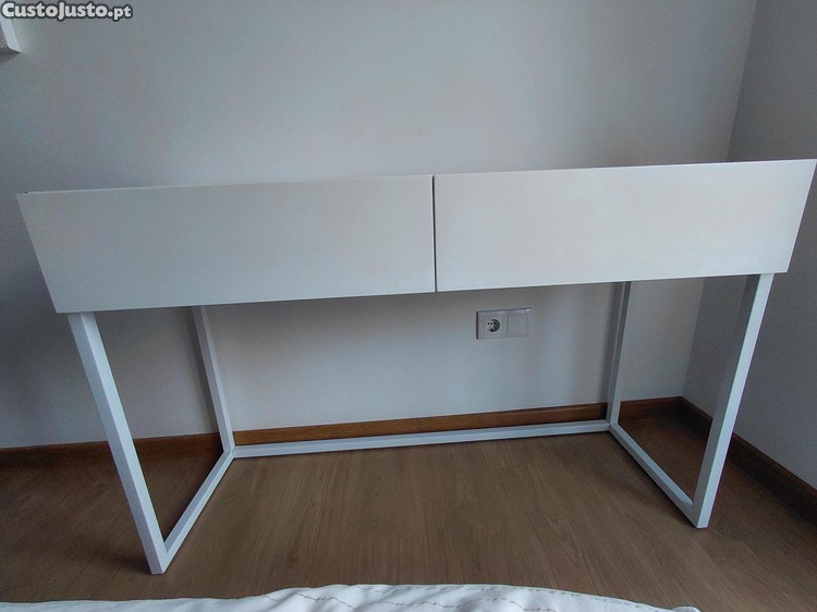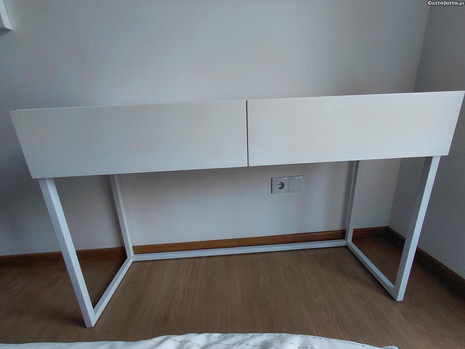 Consola branca com estrutura metálica e duas gavetas e tampo lados de cor branca (mate). Dimensões: 1.20 (comprimento) x 0.77 (altura) x 0.40m (profundidade). Recolha pelo comprador em Faro.