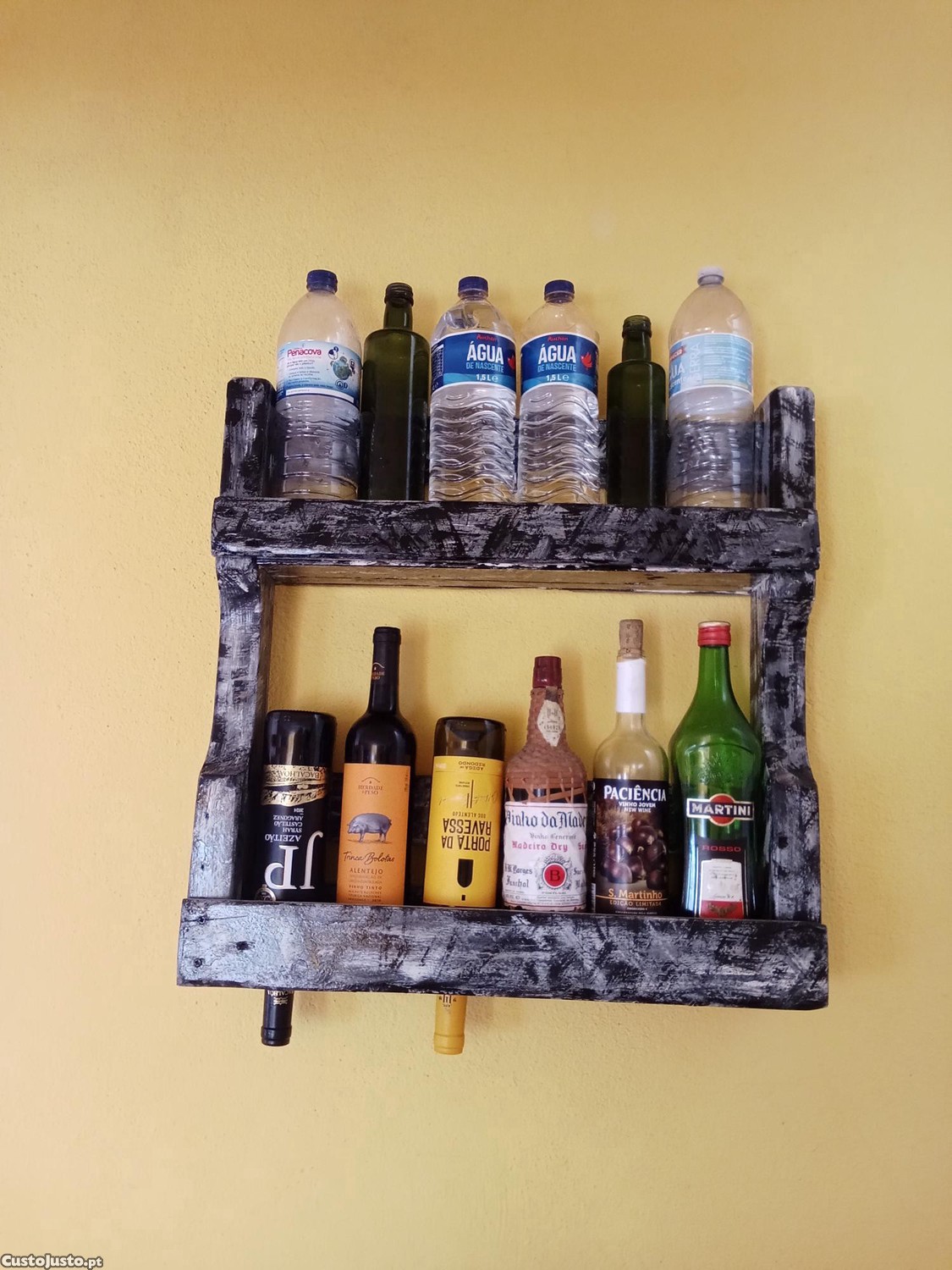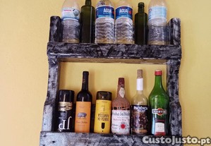 Garrafeira de parede em madeira maciça, peça rústica e decorativa, ideal para cozinha, churrasqueira, adega ou zona de bar.