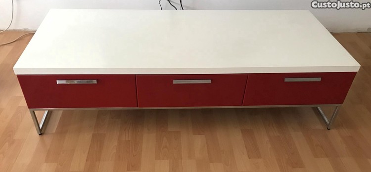 Móvel de TV Bo Concept em bom estado, com três gavetas frente vermelha e tampo branco.