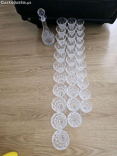 Conjunto composto por 1 garrafa e 33 copos de pé alto, Cristal D' Arques, 11 para água, 11 para vinho tinto e 11 para vinho branco. Ideal para as refeições especiais em família ou com os amigos ou para uma decoração da casa com elegância.
