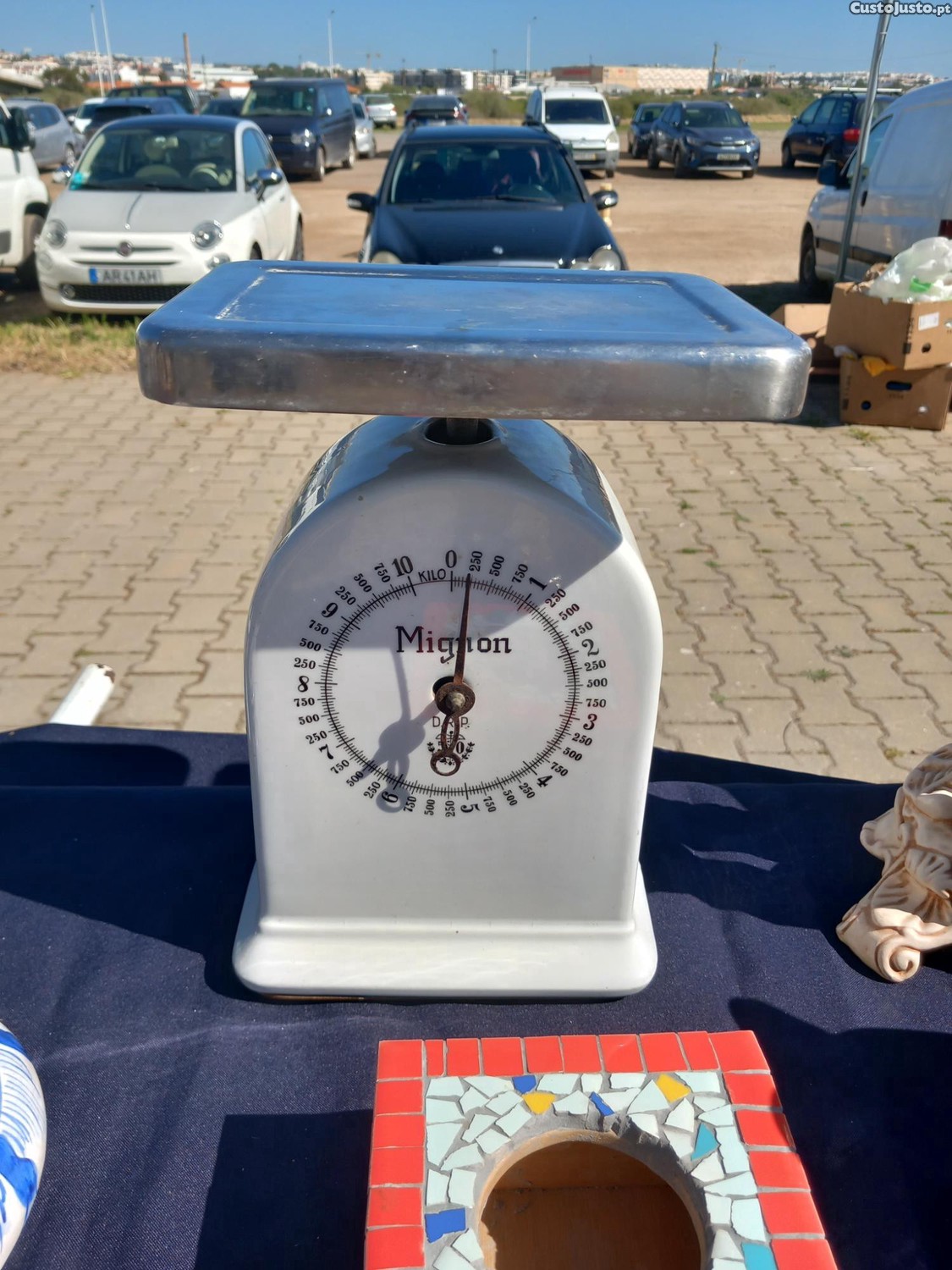 Capacidade: O mostrador indica uma capacidade de pesagem de até 10 quilogramas, com marcações detalhadas para gramas.