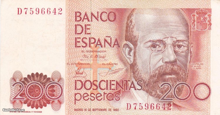 Vendo nota de 200 pesetas, com o n. D7596642, de Leopoldo Alas Clarin, datada de 16 de Setembro de 1980, bem conservada, veja as fotos.