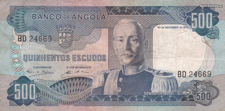 Vendo excelente nota de 500$00 de Angola de Marechal Carmona, datada de 24 Novembro de 1972, com o n. BD 24669, bem conservada.