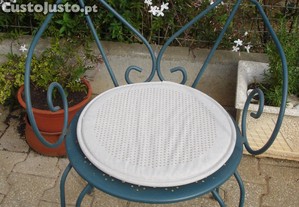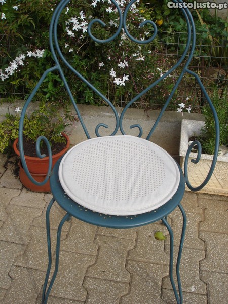 6 cadeiras de ferro com almofada, nunca foram usadas, passaram uns anos numa garagem, neg.