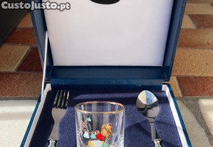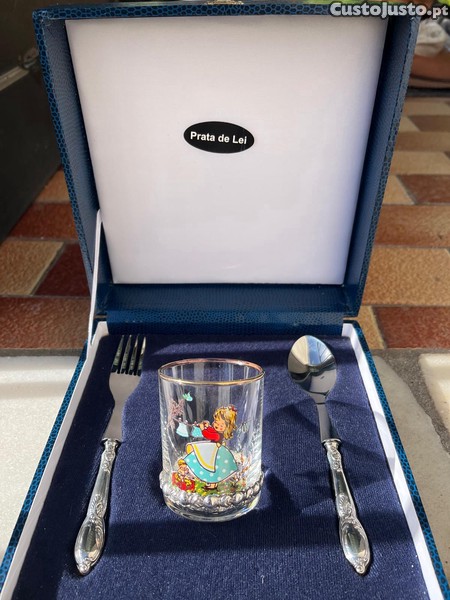 Conjunto de talheres de criança completo e vintage em prata com estojo original perfeito para um presente de batizado ou para enriquecer uma coleção de peças antigas.
