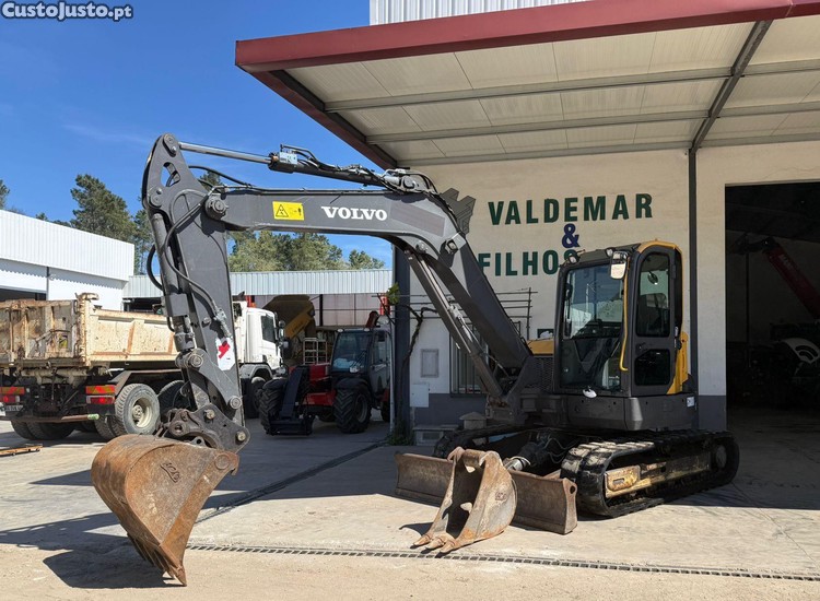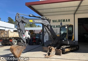 Mini escavadora de marca Volvo, modelo ECR88 D, do ano 2019, com 3231h, equipada com linha de martelo, engate rápido, 2 baldes e ar condicionado. Máquina em excelente estado.