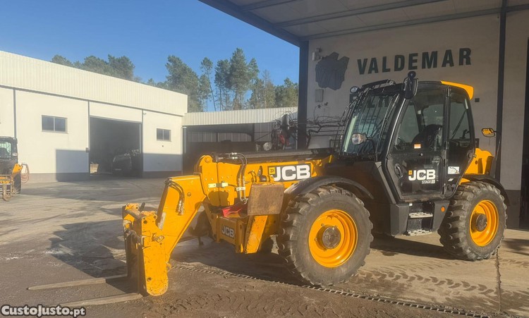 Empilhador multifunções de marca JCB, modelo 540-140, do ano 2021, com 2116h, equipado com linha hidráulica auxiliar, engate rápido, quadro de garfos e ar condicionado. Excelente estado.