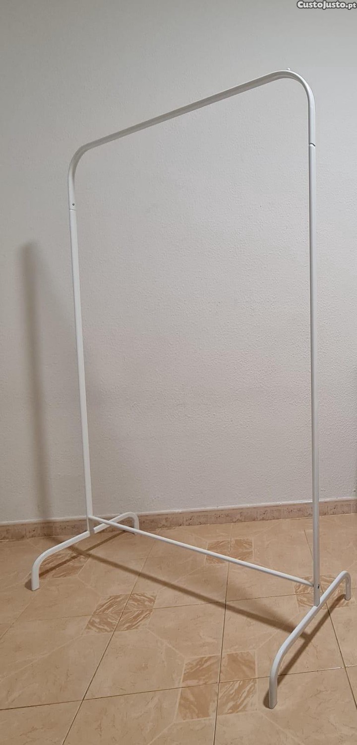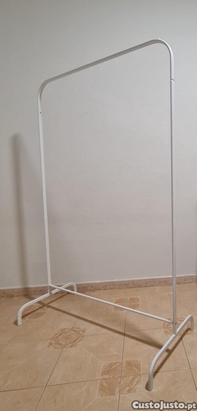 Cabide de metal branco usado, sem rodas, ideal para pendurar roupas ou outros itens.