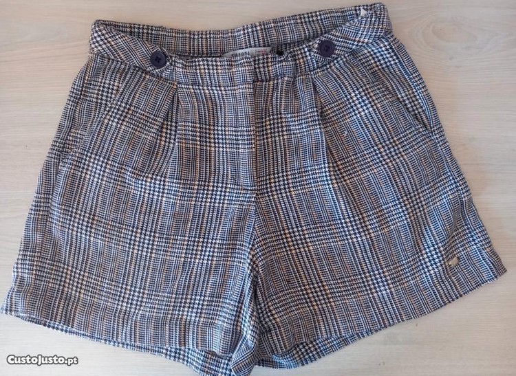 Calções curtos, padrão axadrezado fino, com 2 botões decorativos à frente. Fecho de correr e botão/mola à frente, com bolsos laterais.