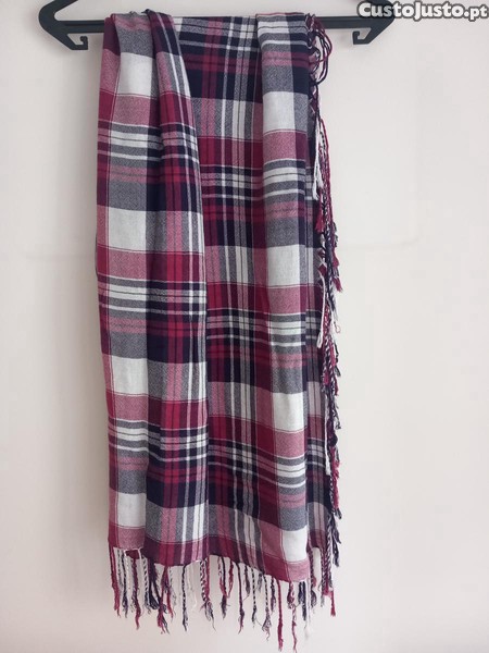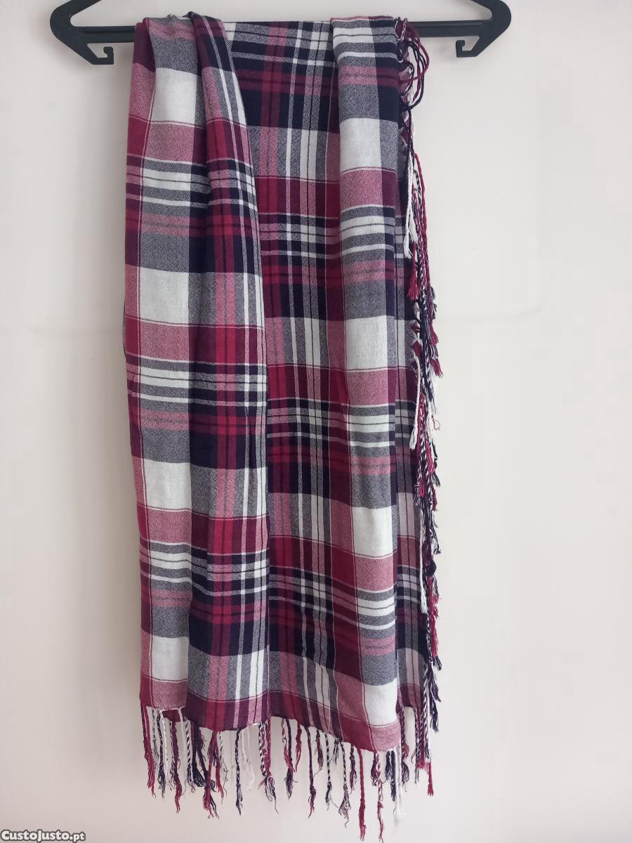 Lenço em padrão xadrezado (cor branca, bordeaux, azul escuro) com franjas, perfeito para dar um toque de cor ao teu outfit.