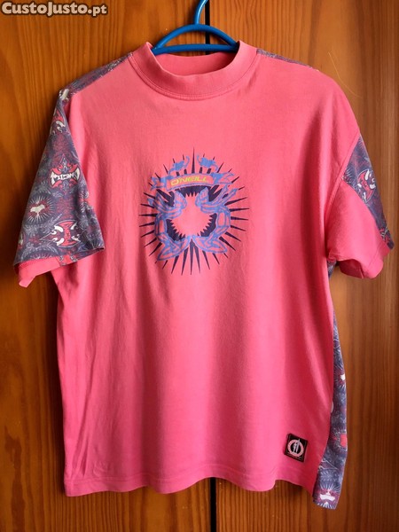 T-shirt vintage da O'Neill dos anos 90 em tons de rosa e roxo.