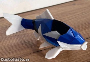 Neste design está a recriação dos padrões característicos da carpa koi com contrastes vibrantes de azul, branco e preto em forma tridimensional.