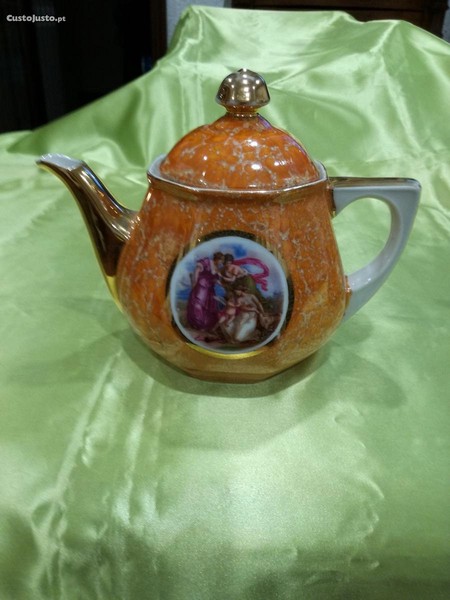 Bule e Leiteira Madre Pérola em tons laranja com reserva e Figuras Vista Alegre 1924, em excelente estado.
