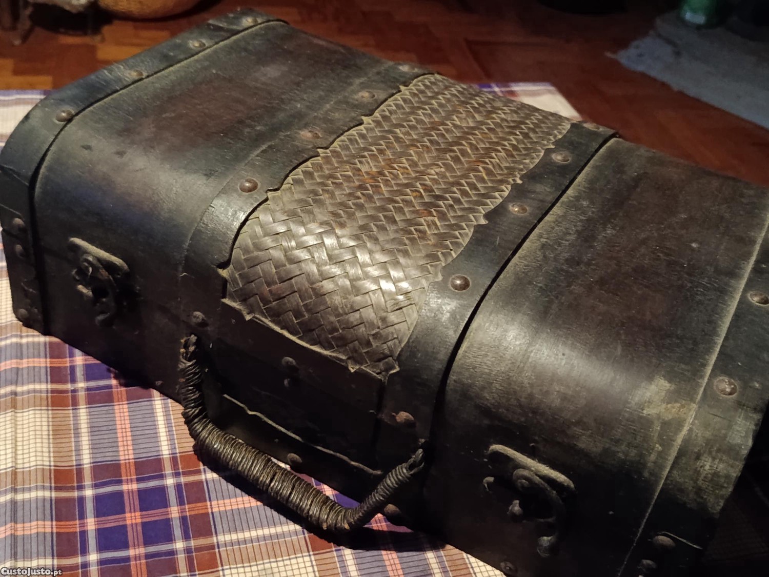 Caixa antiga decoração rustica em madeira com decorações em vime. Fabrico de qualidade, com fechos rotativos e funcionar na perfeição