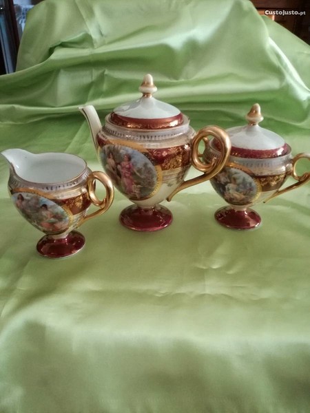 Conjunto de 3 peças de porcelana de Saxe ? decorativa com cenas galantes e dourados incrustados. ATENÇÃO: A peça média (Açucareiro ?) tem a tampa colada como pode ser verificado nas fotos. Pagamento antecipado por transferência Bancária. Portes a cargo do comprador.