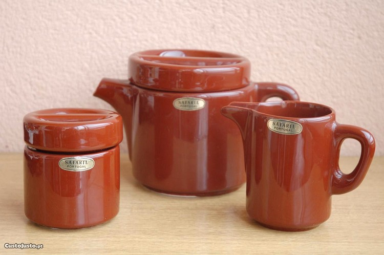 Conjunto vintage de 3 peças serviço de chá modernista das cerâmicas Safaril Portugal(Aljubarrota-Alcobaça) composto por um bule(altura 14 cm ,largura 22 cm e um diâmetro de 13 cm), um açucareiro e uma leiteira em perfeito estado como novo(nunca usado).Entrega em mão ou envio bem protegido pelos correios CTT(mais portes).