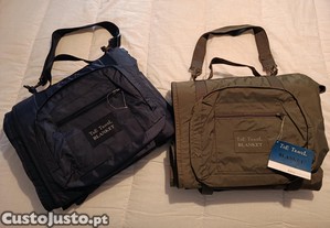 Versateis mantas de viagem que se dobram numa mala impermeavel com alça de tiracolo e pega.