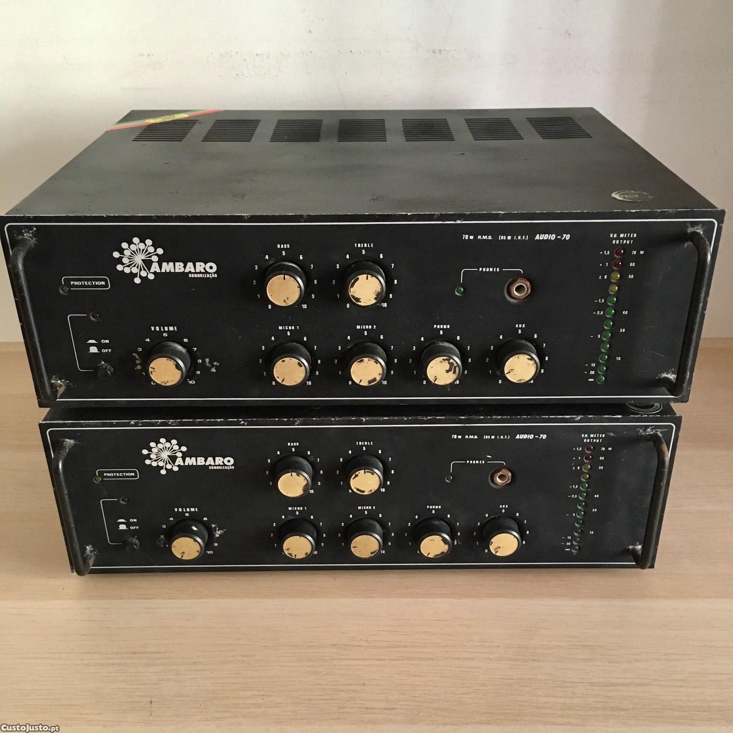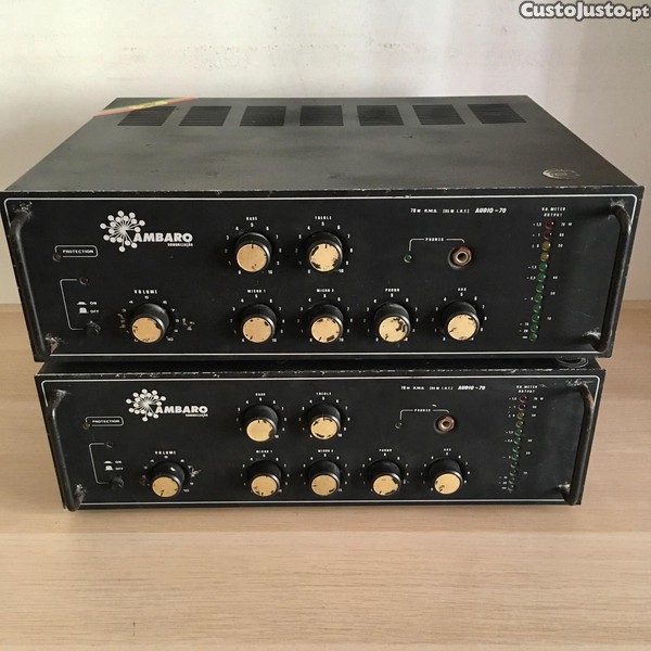 Dois amplificadores Ambaro Sonorização, modelo Audio-70, feitos em Portugal.