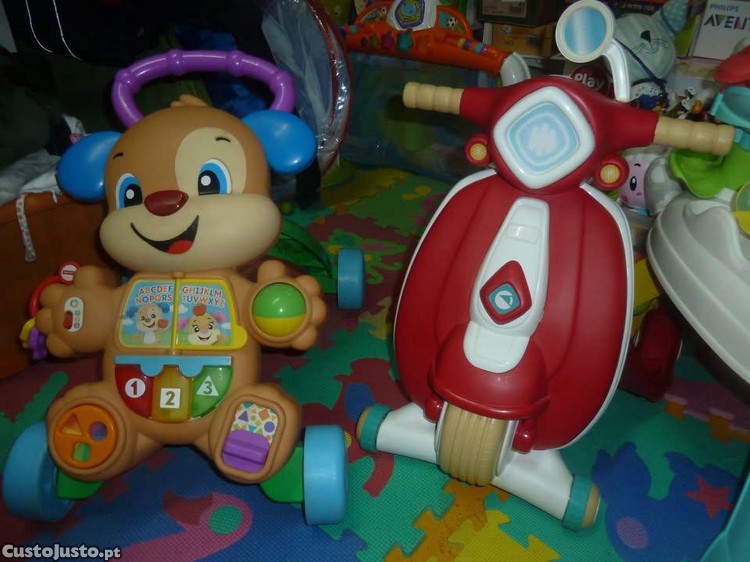 Cão Fisher Price 20EUR - o Cãozinho apresenta o alfabeto, as formas, as cores, a contagem e até as primeiras palavras! Ao empurrar o Cãozinho o bebé ouve músicas divertidas e frases motivadoras. Inclui 37 atividades práticas como teclas de piano e nariz com luz, brinquedos para rolar e girar, canções, páginas para virar e muito mais!