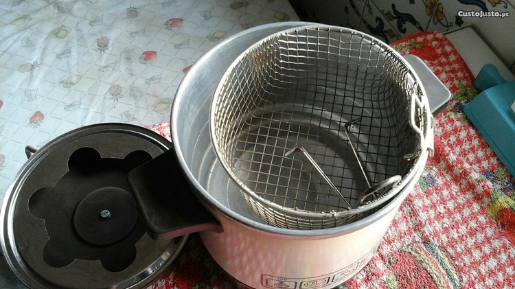 Pequena panela eletrica fritar etc ideal para duas ou quatro pessoas, em estado impecável botão comutador para várias temperaturas, 150,170 e 190 graus leva cerca de 1,25 lts óleo alt 18 cm larg 16 com escoador em rede com pega e apetrecho para fondue.