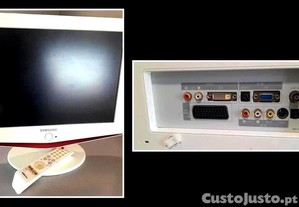 TV Samsung, mod. LE19R71W, tamanho 19", em branco, ecrã plano, com comando e cabo de alimentação, com suporte de parede incorporado até 45º, excelente estado.