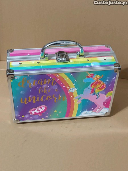 Caixa de armazenamento e arrumação, para materiais de desenho e trabalhos manuais ou bijutarias e maquilhagens, destinada principalmente a crianças. Feita de cartão muito resistente e lavável, a sua construção é reforçada com metal de alumínio que faz dela uma caixa muito robusta. Tem uma asa, duas prateleira movíveis e mede no exterior 25 cm x 16 cm x 9 cm. O fecho e as dobradiças estão a funcionar muito bem. Em bom estado geral e muito decorativa. Barato para desocupar. Negociável, vendo pela melhor oferta. Possibilidade de vir buscar em mão.