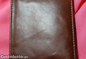 Carteira em pele tipo trifold com espaço para moedas, notas e documentos.