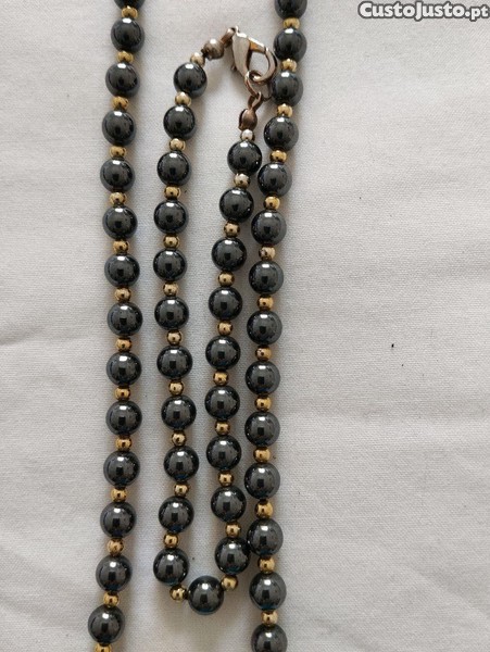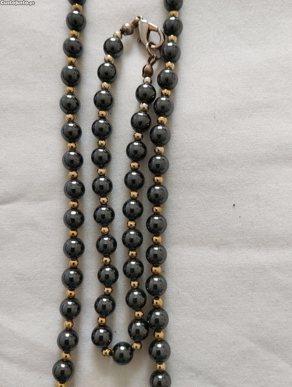 Colar e pulseira com bolinhas cinzentas brilhantes e bolinhas douradas.