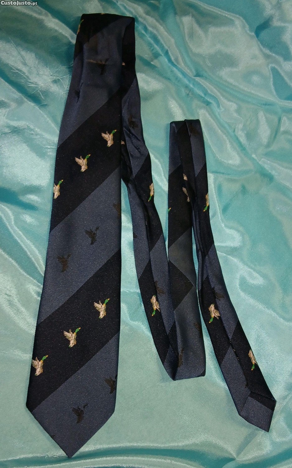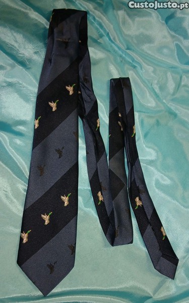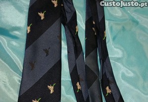 Uma gravata slim que apresenta um padrão de patos voadores (ou patos-reais) em miniatura, bordados, sobre um fundo azul-marinho com riscas diagonais em tons de azul.