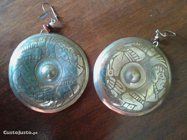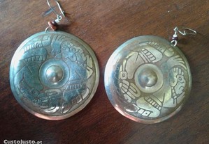 - par de brincos em metal, prateado e cor terra, com motivos gravados; 5 cm de diâmetro (EUR5)