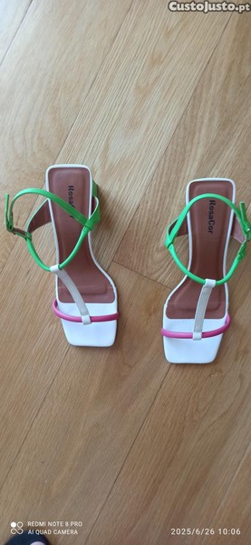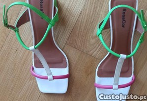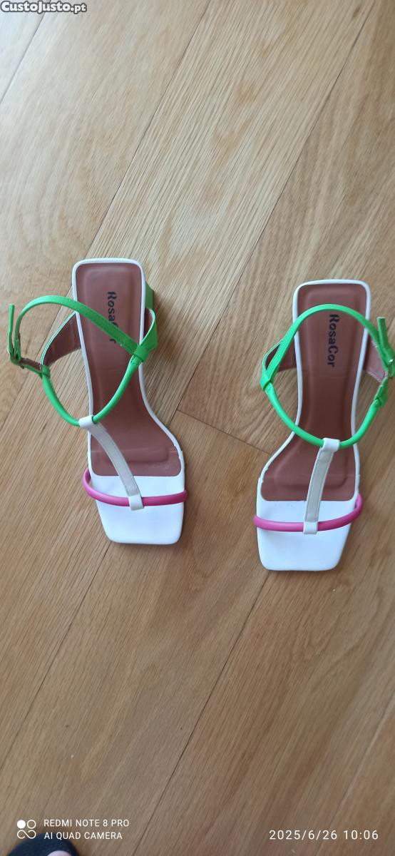 Sandálias marca brasileira "Rosa Cor, de tiras branca, verde e rosa, usadas uma vez. Como novas. n, 38.