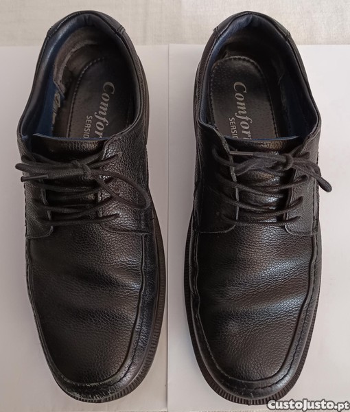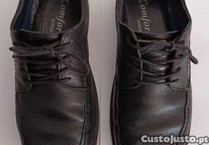 Sapatos clássicos pretos em couro, perfeitos para passeios (na cidade, no campo ou à beira-mar), oferecendo conforto e estilo. Design elegante com atacadores e sola robusta. Ideais para quem procura versatilidade e elegância em cada passo. Tamanho 43.