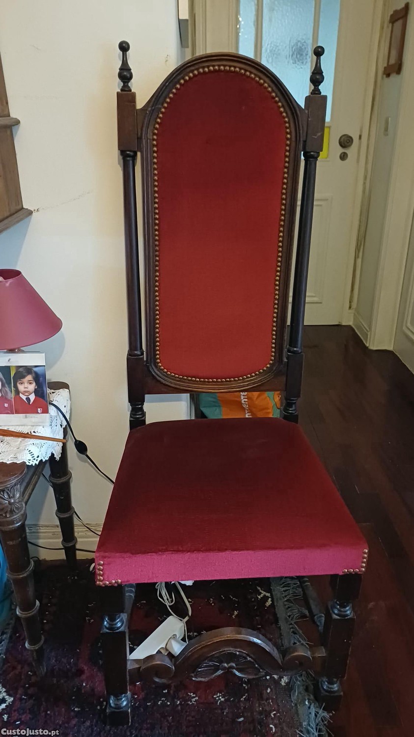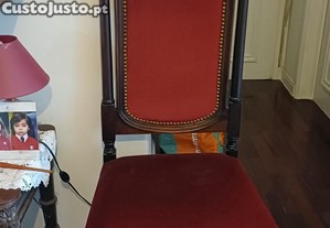 Cadeira senhorial em madeita, de costas altas, forrada a veludo vermelho