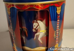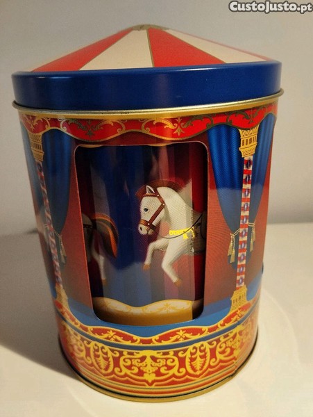 Caixa de música decorativa impecável em formato de carrossel girando o seu interior. Funciona dando corda conforme foto. Tem 16 cm de altura e 12 de diâmetro.