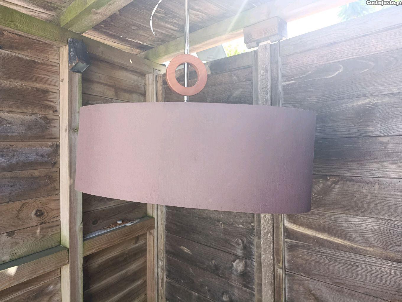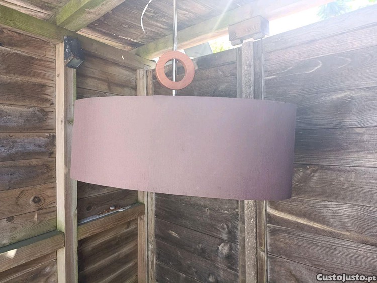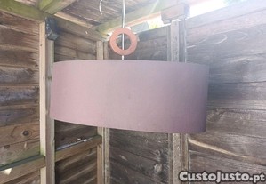 Candeeiro de tecto para sala ou outro com abajur em tons castanho, sendo que no seu interior tem um padrão em outros tons
