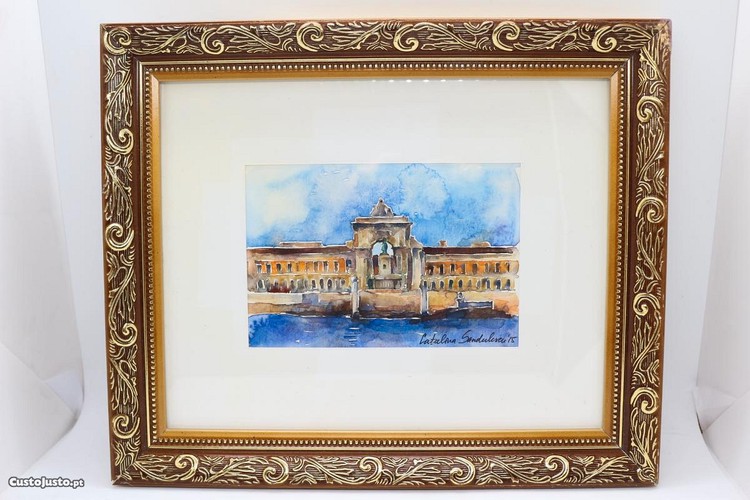 Quadro de Catalina S ndulescu com Aguarela sobre papel motivo "Praça do Comércio" assinado e datado de 2015, acompanhado de certificado de autenticidade