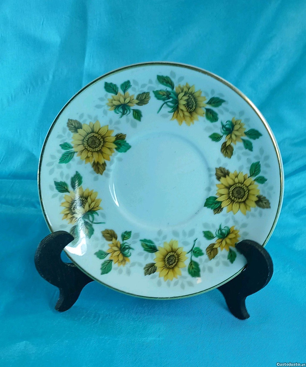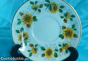 Belo prato de cerâmica da marca Royal Vale,fabricado em Englaterra, decorado com um padrão de girassóis amarelos e folhas verdes, e rebordo dourado para completar a sua colecção ou apenas como peça de decoração em sua casa.