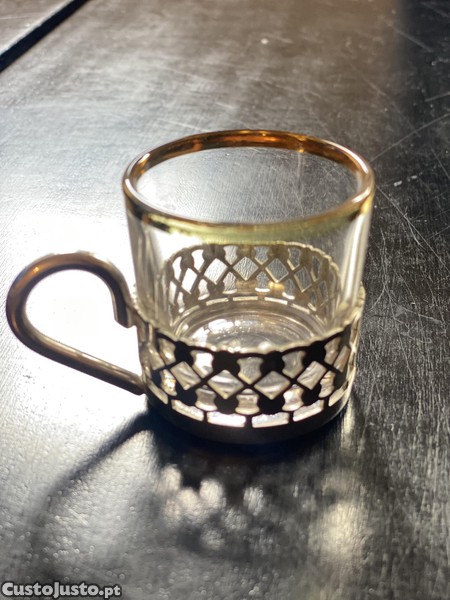 Conjunto de 2 pequenas chávenas antigas em vidro com suporte metálico recortado e pega integrada.