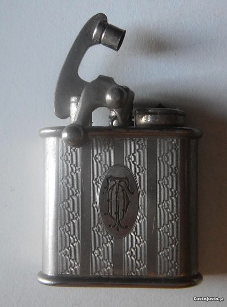 -- DESCRITIVO: Em prata, decorado com um padrão subtil Art Déco, apresenta-se com um monograma - letras TD (ou TQ) - gravado numa reserva oval na parte frontal do isqueiro.