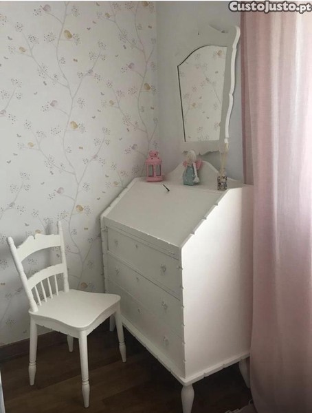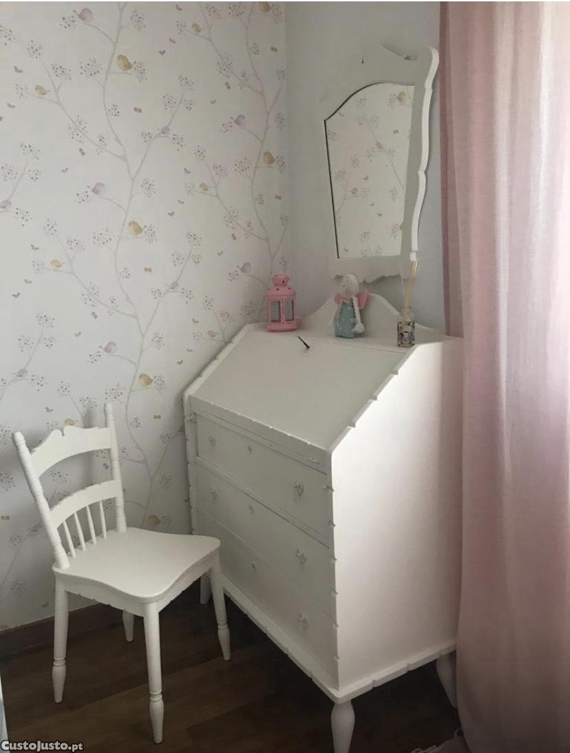 A escrivaninha, bem como o espelho e a cadeira são de madeira maciça, muito antiga e fazem conjunto. Foram tratados e pintados em estufa há dois anos, para decorar o quarto de uma menina.