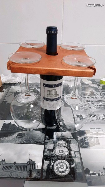 Garrafeira com suporte para 4 copos de pé alto de vinho.