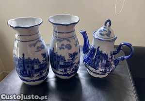 Conjunto de 3 peças em cerâmica, decoradas a azul e branco com cenas paisagísticas de estilo tradicional.